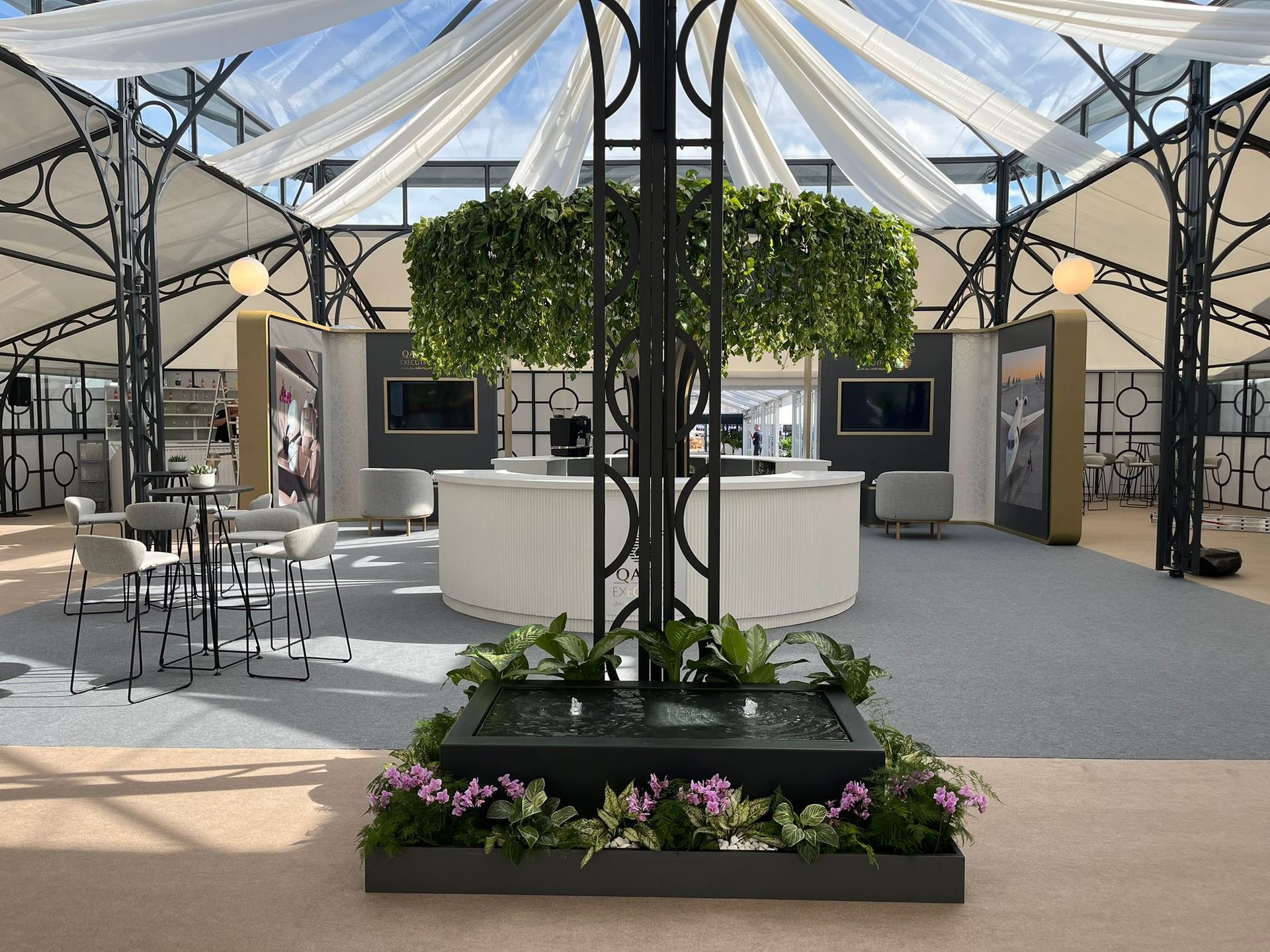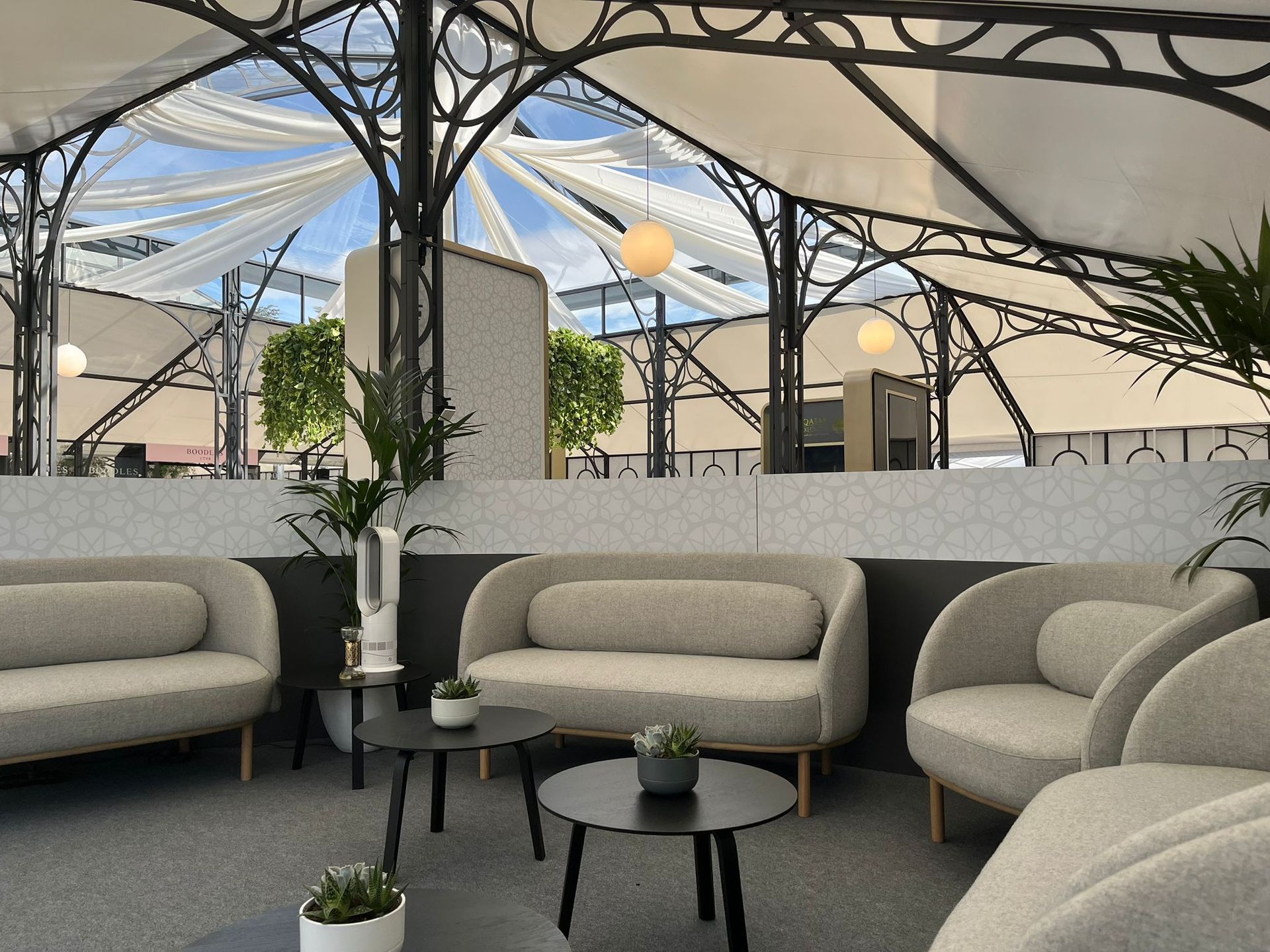 • A living room with a couch , chairs , tables and a bucket of champagne.