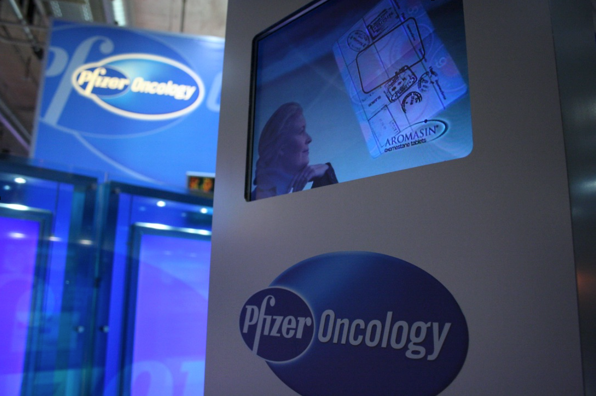 • A group of people standing in a field with a sign that says `` go with the pig ''.