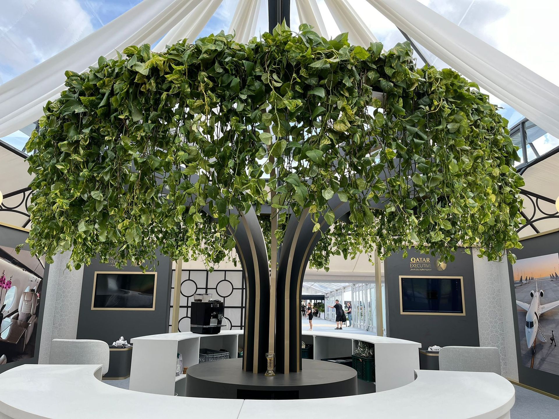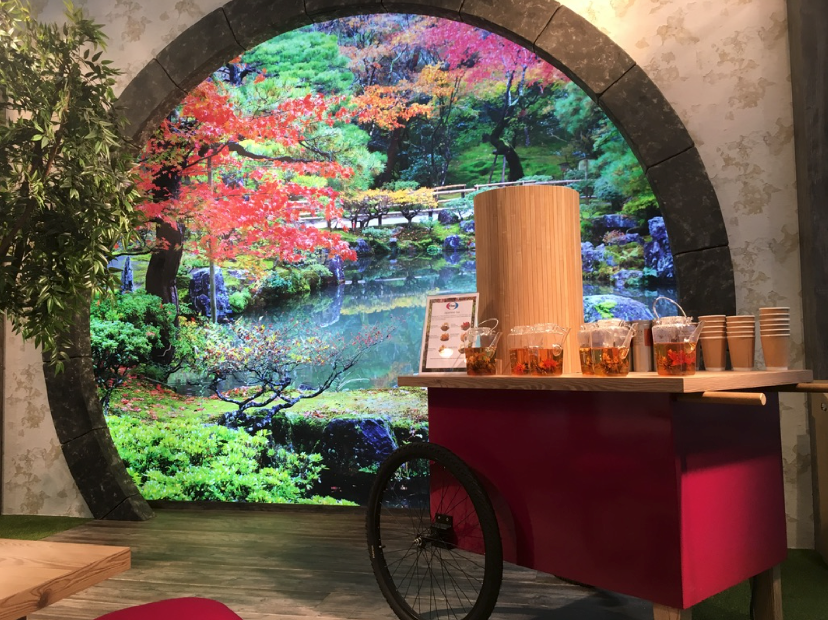 • A room with a table and chairs in front of a wall with a picture of trees on it.
