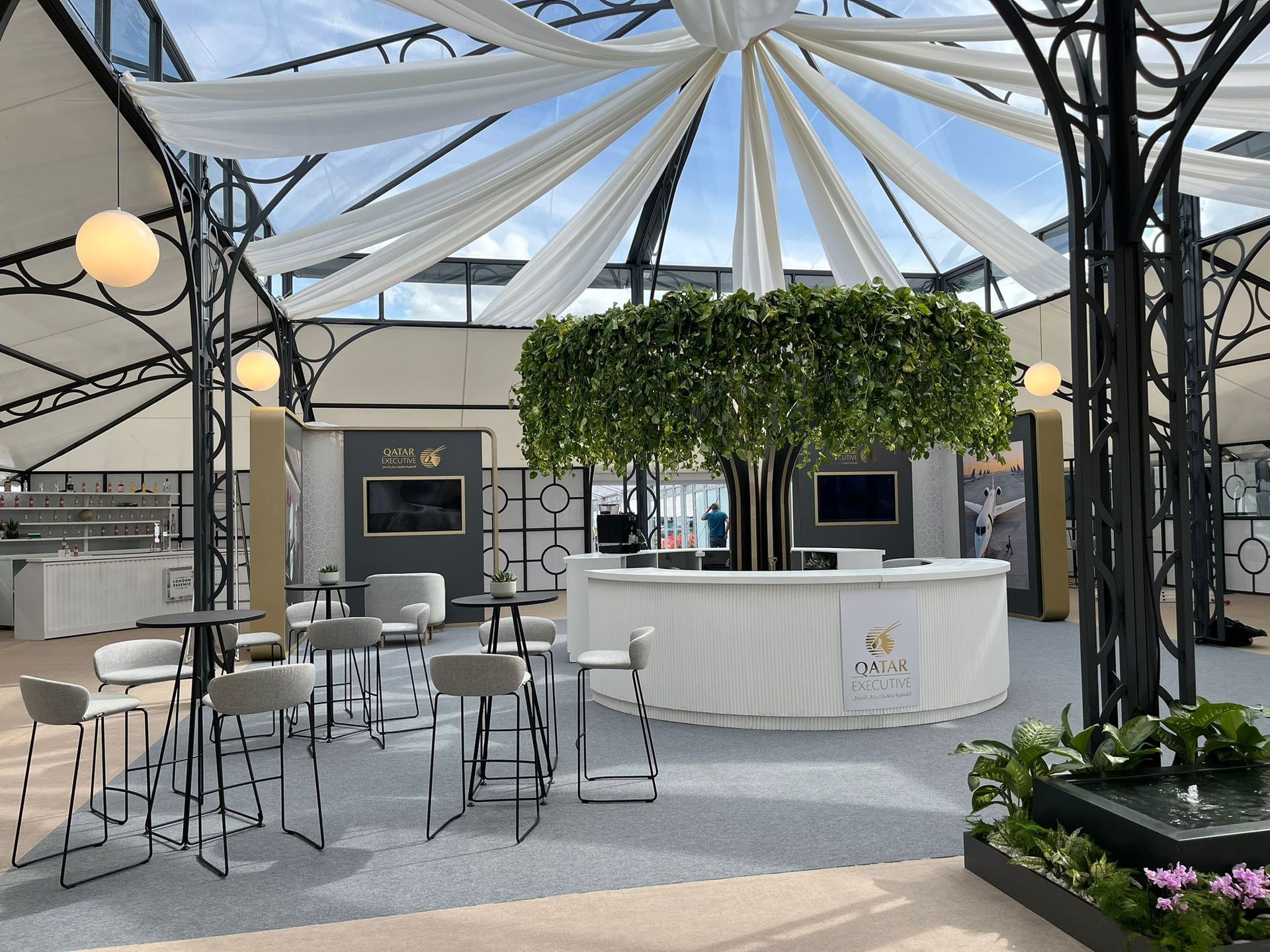• A woman in a red uniform is standing in front of a sign that says qverse